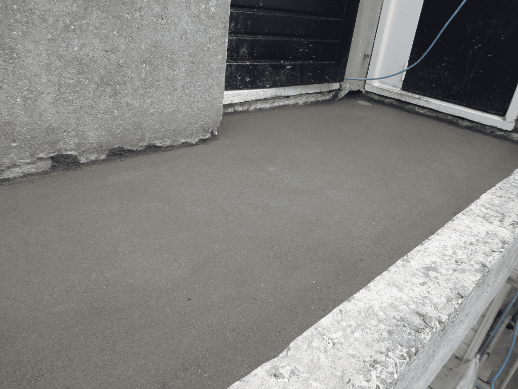 Na reparatie van de vloer, beton diktekanten, opstaande randen, borstwering, putten enz. wordt het balkon weer gecoat en geschilderd.