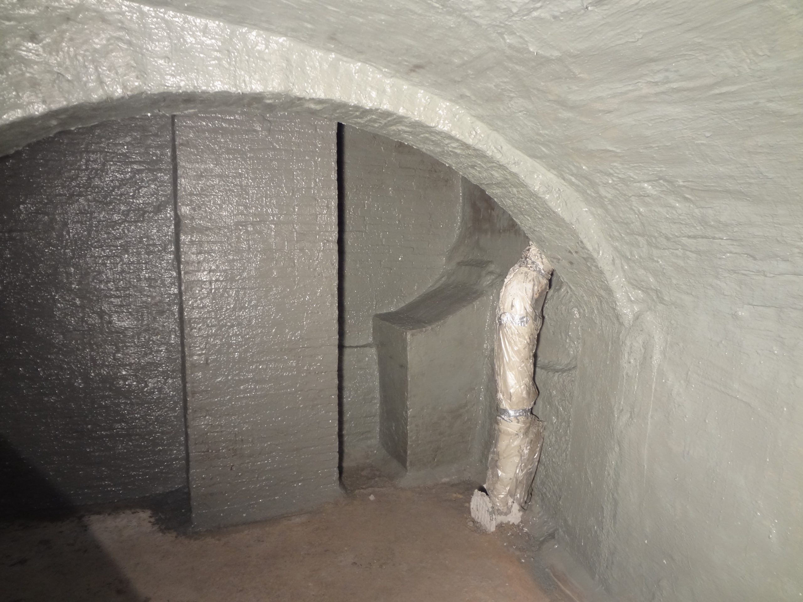 De derde stap is het afdichten van de kelder. Hierbij impregneren we de muren met een verstevigingsvloeistof. Daarna plaatsen we een spachtellaag en een elastische laag met flexibele bitumineuze rubberemulsie.