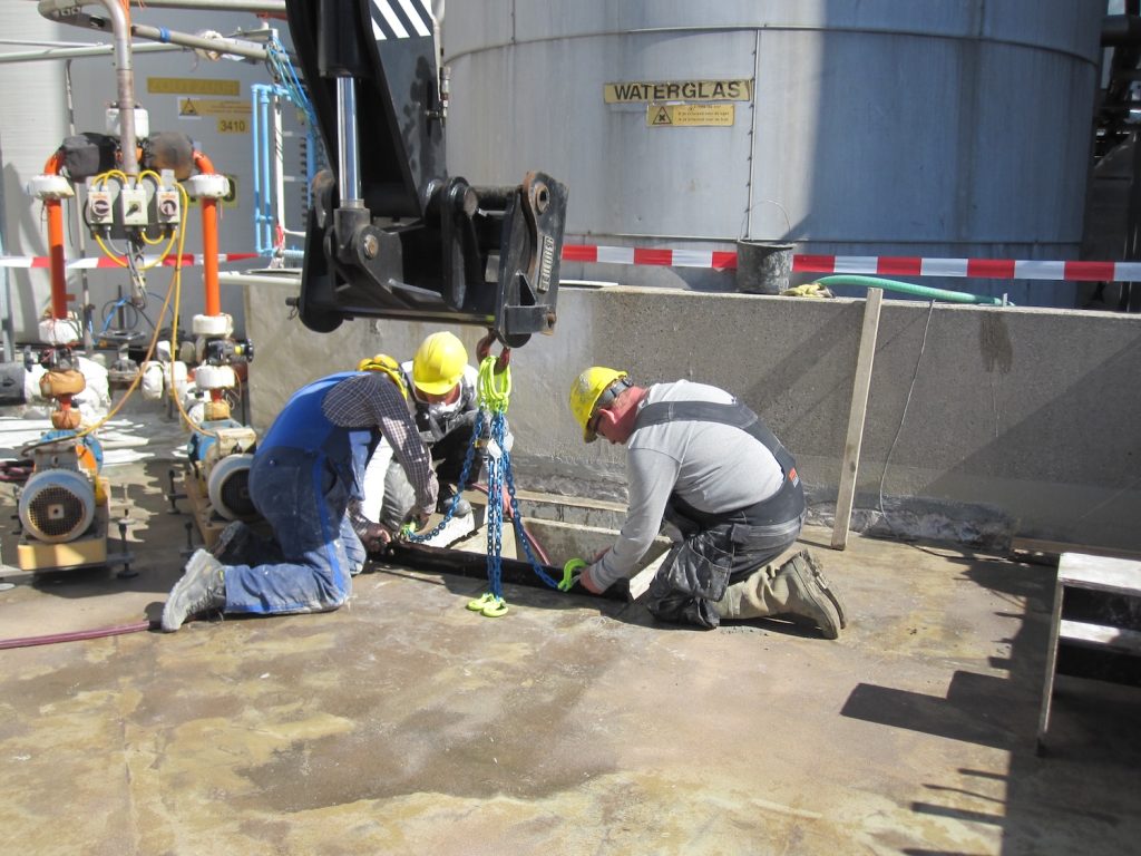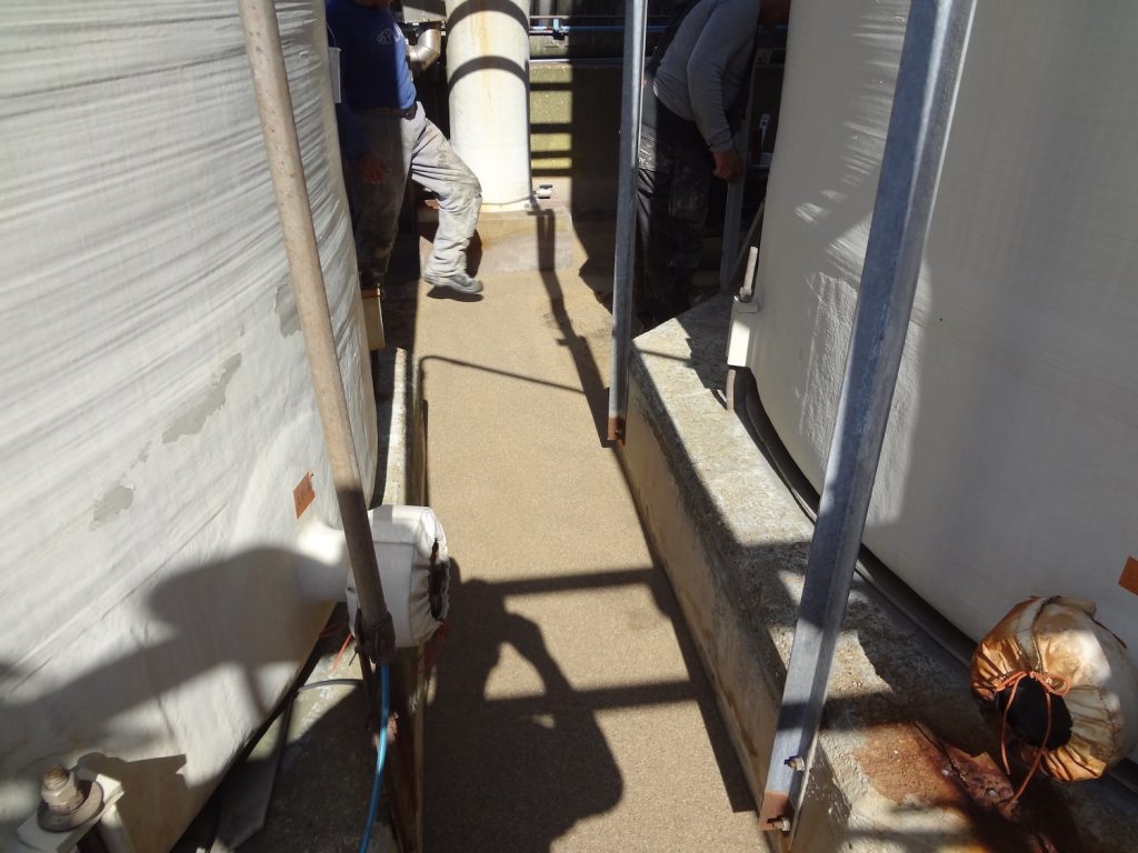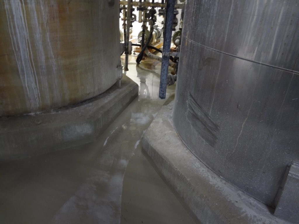 Het tankenpark van een petrochemisch bedrijf wordt voorzien van een op afschot aangebrachte chemicaliënbestendige vloeistofdichte kunststofvloer.